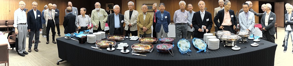 初めに堀代表が挨拶され、暑い中でのご案内で心配されたが皆様お集まり下さり、また大阪から3名の方が参加され、これまた嬉しいことと述べられました。現在の在籍者が132名で平均年齢が85.83歳とご紹介された後に、前回例会以降お亡くなりになった本橋勲氏、醍醐忠和氏、越田熟氏、真下正大氏、吉岡敬恭氏、比護喜一郎氏の6名のお名前を読み上げられ、参加者全員で黙祷を捧げました。